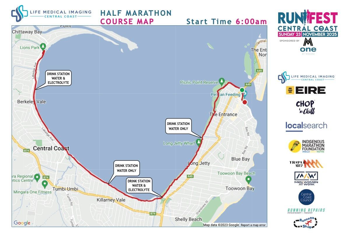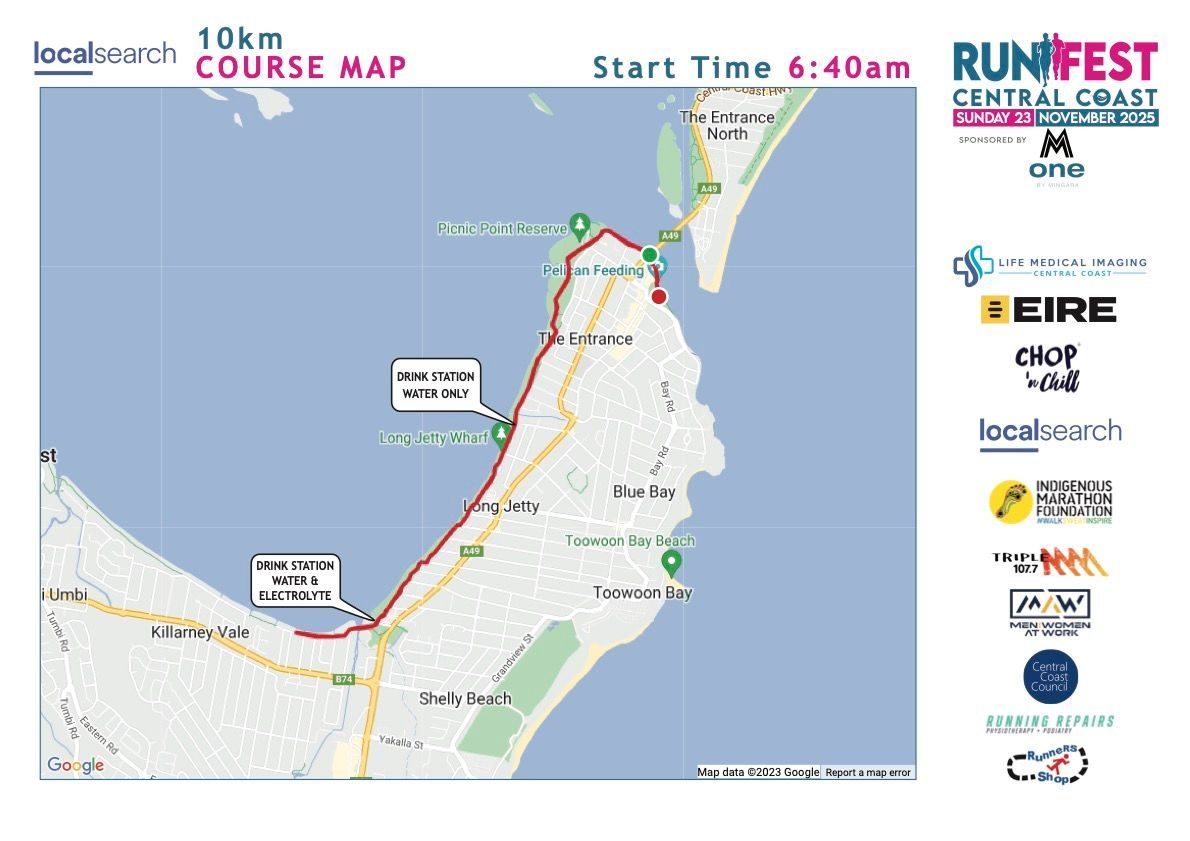 Fast, Flat and Scenic Course – The course is an out and back course. Starting under The Entrance Bridge, at The Entrance it proceeds along the Entrance Road north before linking up with the cycleway and continuing along the path for 10.5km. The course returns back along same route to finish at the Memorial Park, The Entrance.