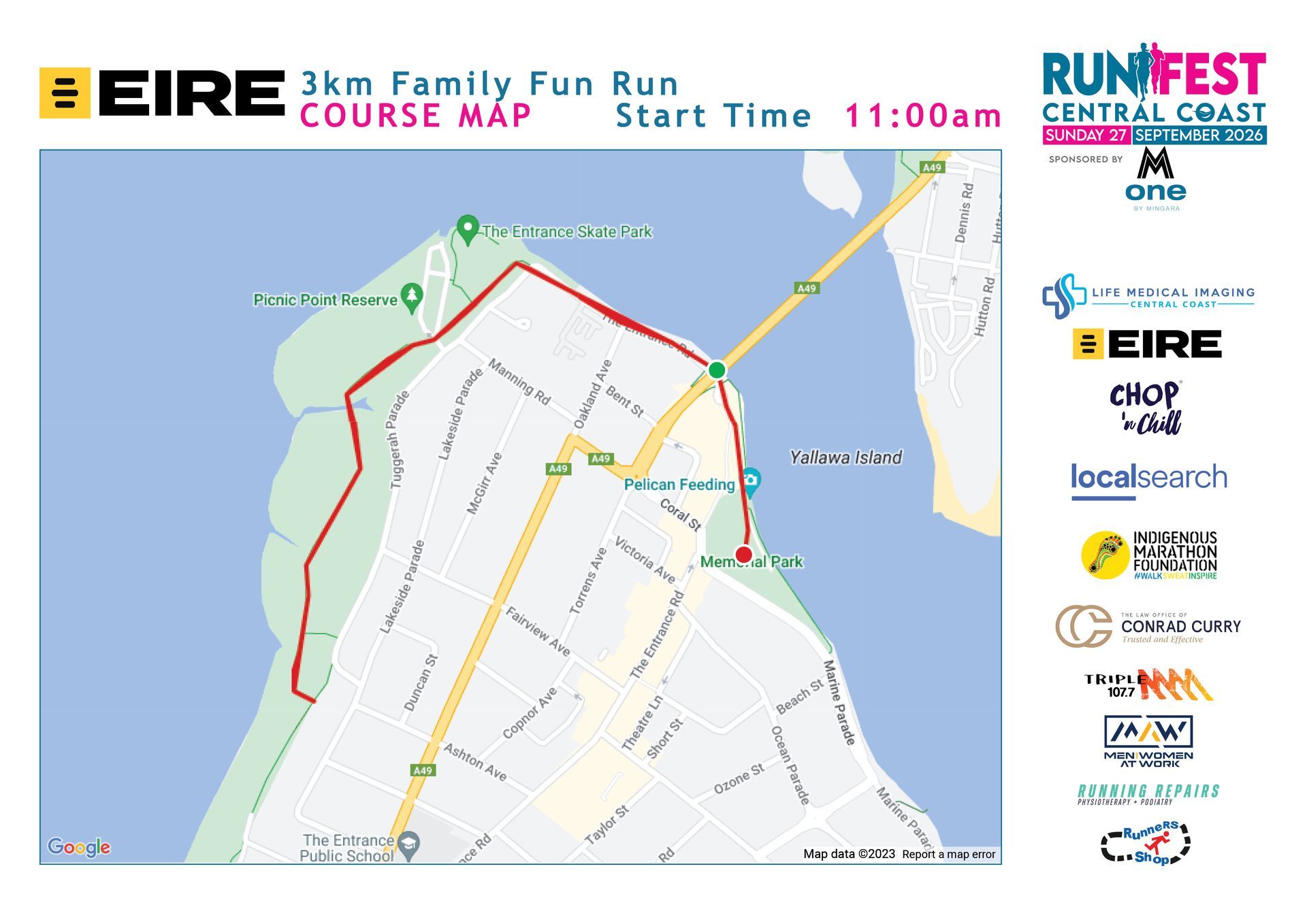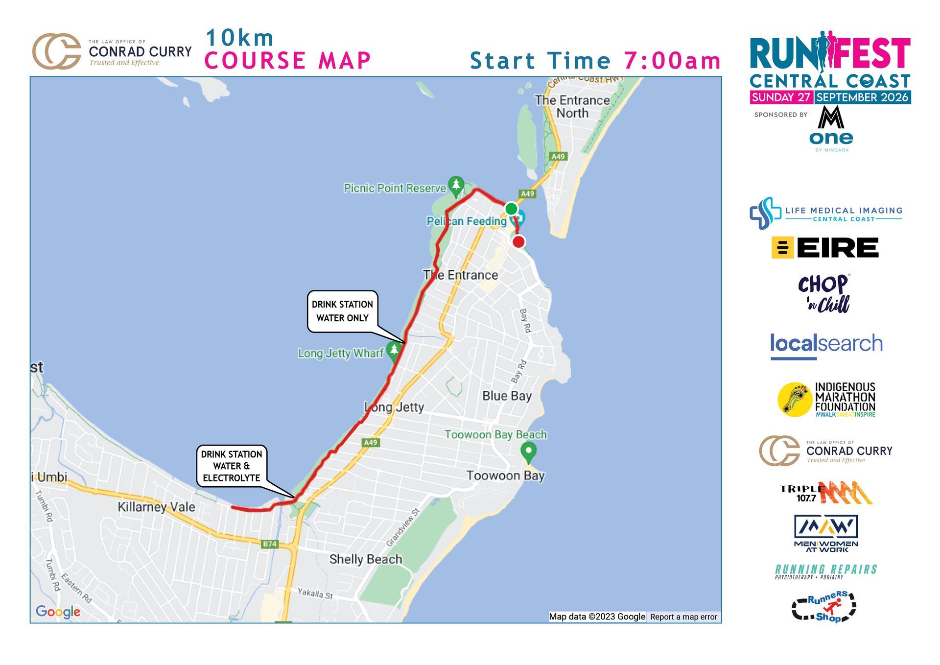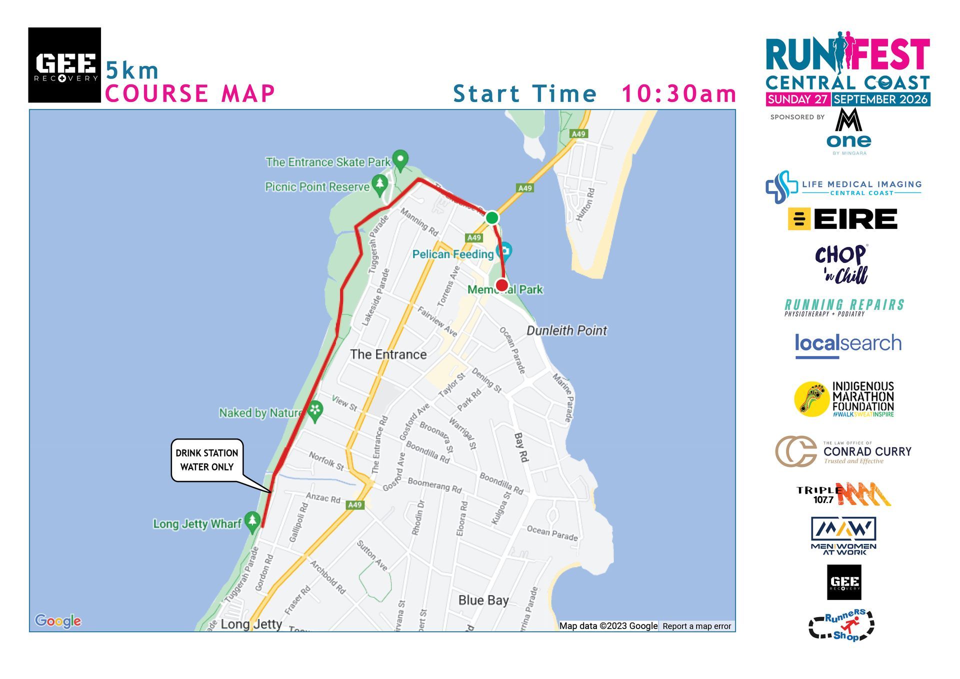 Fast, Flat and Scenic Course – The course is an out and back course. Starting under The Entrance Bridge, at The Entrance it proceeds along the Entrance Road before linking up with the cycleway and continuing along the path for 10.3km at Lions Park Chittaway Bay. The course returns back along same route to finish at the Memorial Park, The Entrance.