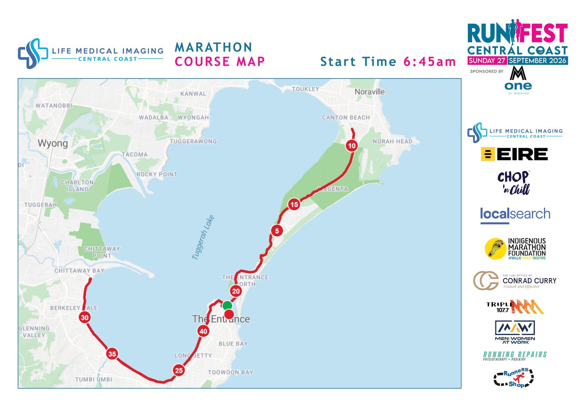 Fast, Flat and Scenic –Starting under The Entrance Bridge, at The Entrance. Runners will take a left turn at Oakland Ave and then another left at Bent St to then join onto The Entrance Bridge. Runners will then follow the route for 10.5km making a point turn at Evans Road, Canton Beach. Runners will then retrace there steps back the bridge and follow the signs to once again pass through the start line (21.1km) to then complete southern section. The course proceeds along the Entrance Road before linking up with the cycleway and continuing along the path (31. 5km) at Lions Park Chittaway Bay. The course returns back along same route to finish at the Memorial Park, The Entrance.