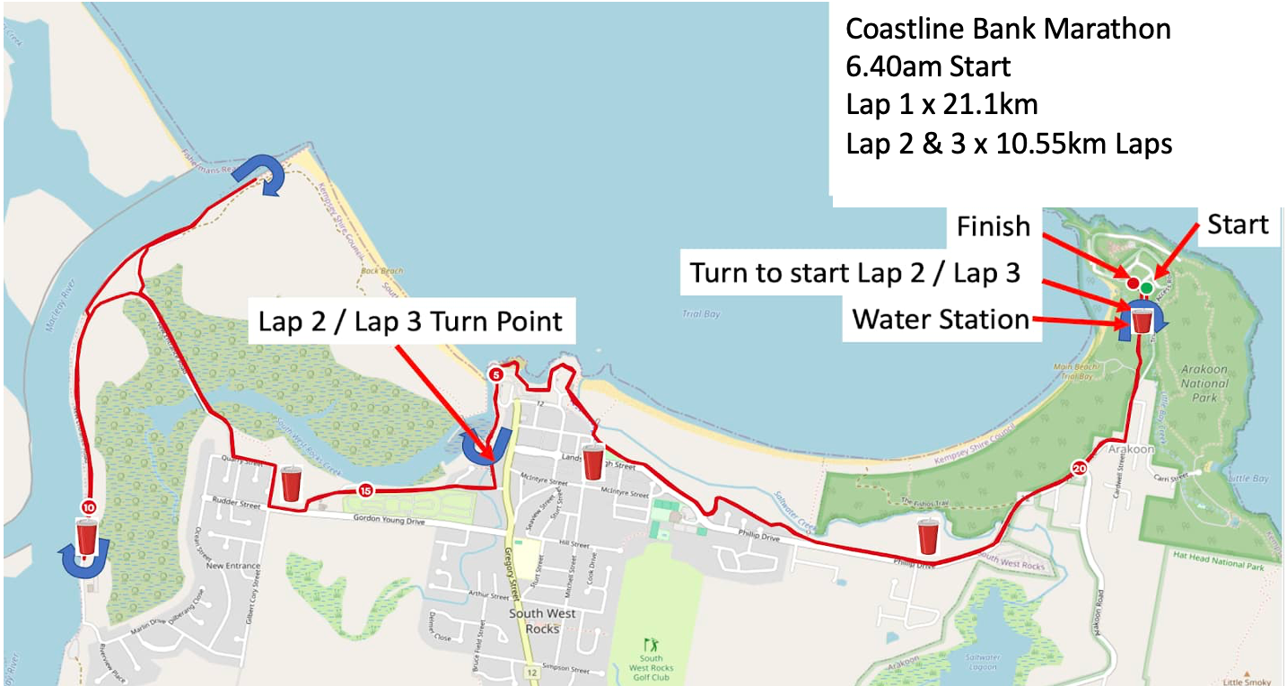 - Marathon consists of 1 21.1km lap followed by 2 10.55km laps.