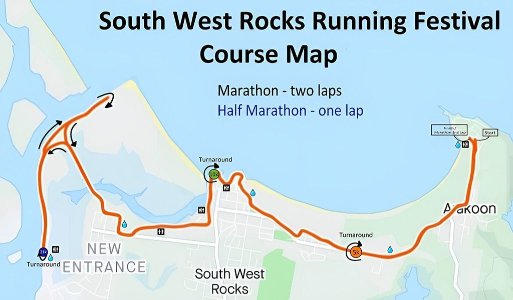 From here remain on left side of the road before veering left onto the breakwall path for 400m then right onto dirt road to new Entrance Rd. Turn Left here and proceed back to finish area. Marathon runners will go past finish and commence their second lap.